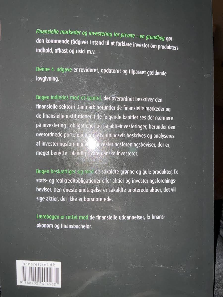 Finansielle markeder og investering for private - en grundbog er din indgang til at forstå og formidle investeringers indhold, afkast og risici. Forfattet af Søren Dalgaard, Hans Jørgen Biede og Mikkel Harbo Bossow, giver bogen et klart og overskueligt overblik målrettet private investorer og kommende rådgivere. Bogen henvender sig bredt til alle med interesse for investering, men er særligt velegnet til studerende på finansøkonom- og finansbacheloruddannelser. Denne 4. udgave fra 2023 er fuldt opdateret med de nyeste regler, relevante data samt tilføjede kapitler om bæredygtighed og den grønne omstilling. Gennem gennemgang af det danske finansielle system og konkrete værktøjer lærer du at analysere de mest almindelige værdipapirer for private - herunder obligationer, aktier, investeringsforeningsbeviser og ETF’er. Formålet er, at du opnår et solidt grundlag for både at rådgive om investeringer og selv at træffe kvalificerede investeringsbeslutninger.