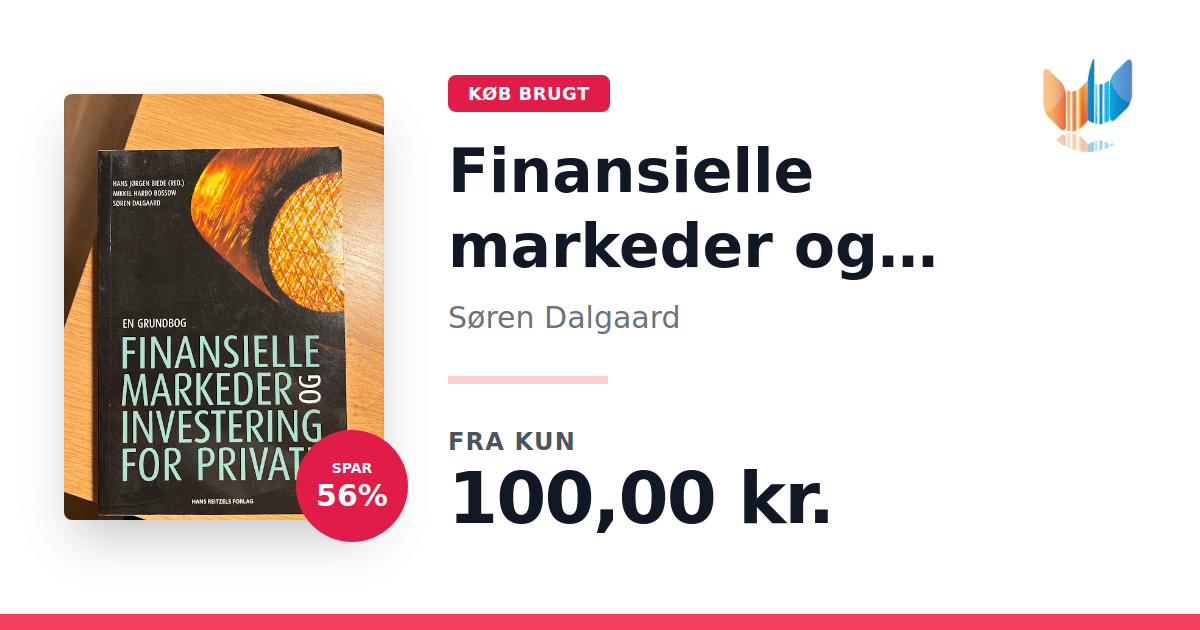 Lige nu kan du købe "Finansielle markeder og investering for private" af Søren Dalgaard til kun 100,00 kr. Du sparer hele 56% af nyprisen! Bogen du ser her er brugt, og i perfekt stand. Vi har i øjeblikket 3 eksemplarer til salg af "Finansielle markeder og investering for private", så husk at se de forskellige udgaver.