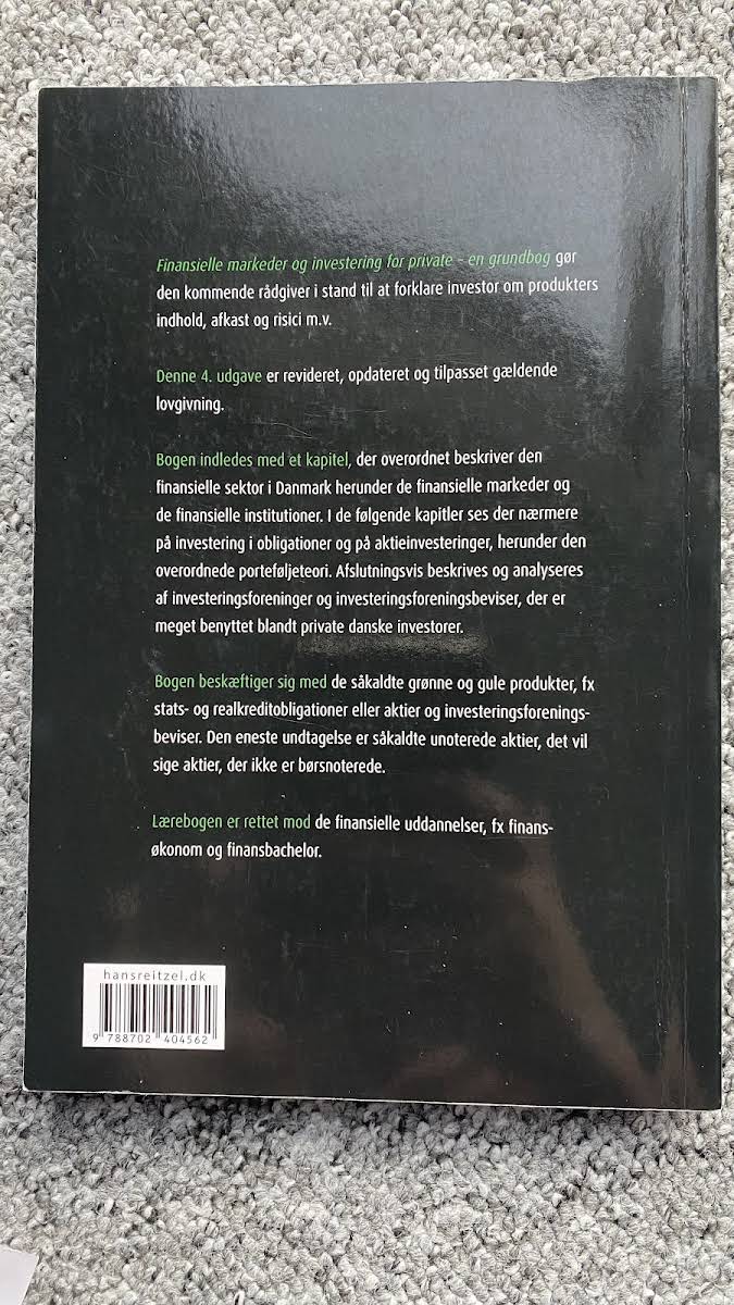 Finansielle markeder og investering for private - en grundbog er din indgang til at forstå og formidle investeringers indhold, afkast og risici. Forfattet af Søren Dalgaard, Hans Jørgen Biede og Mikkel Harbo Bossow, giver bogen et klart og overskueligt overblik målrettet private investorer og kommende rådgivere. Bogen henvender sig bredt til alle med interesse for investering, men er særligt velegnet til studerende på finansøkonom- og finansbacheloruddannelser. Denne 4. udgave fra 2023 er fuldt opdateret med de nyeste regler, relevante data samt tilføjede kapitler om bæredygtighed og den grønne omstilling. Gennem gennemgang af det danske finansielle system og konkrete værktøjer lærer du at analysere de mest almindelige værdipapirer for private - herunder obligationer, aktier, investeringsforeningsbeviser og ETF’er. Formålet er, at du opnår et solidt grundlag for både at rådgive om investeringer og selv at træffe kvalificerede investeringsbeslutninger.