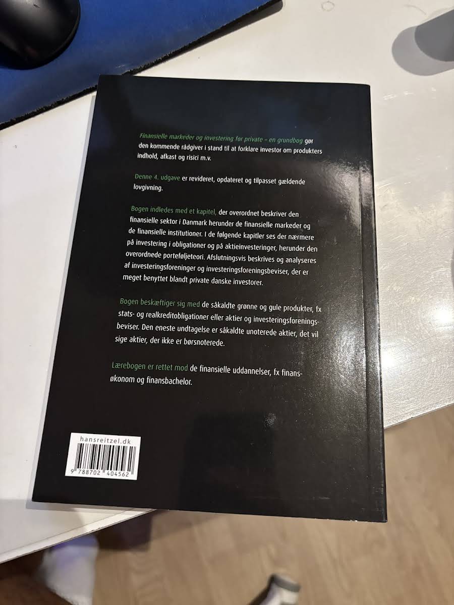Finansielle markeder og investering for private - en grundbog er din indgang til at forstå og formidle investeringers indhold, afkast og risici. Forfattet af Søren Dalgaard, Hans Jørgen Biede og Mikkel Harbo Bossow, giver bogen et klart og overskueligt overblik målrettet private investorer og kommende rådgivere. Bogen henvender sig bredt til alle med interesse for investering, men er særligt velegnet til studerende på finansøkonom- og finansbacheloruddannelser. Denne 4. udgave fra 2023 er fuldt opdateret med de nyeste regler, relevante data samt tilføjede kapitler om bæredygtighed og den grønne omstilling. Gennem gennemgang af det danske finansielle system og konkrete værktøjer lærer du at analysere de mest almindelige værdipapirer for private - herunder obligationer, aktier, investeringsforeningsbeviser og ETF’er. Formålet er, at du opnår et solidt grundlag for både at rådgive om investeringer og selv at træffe kvalificerede investeringsbeslutninger.