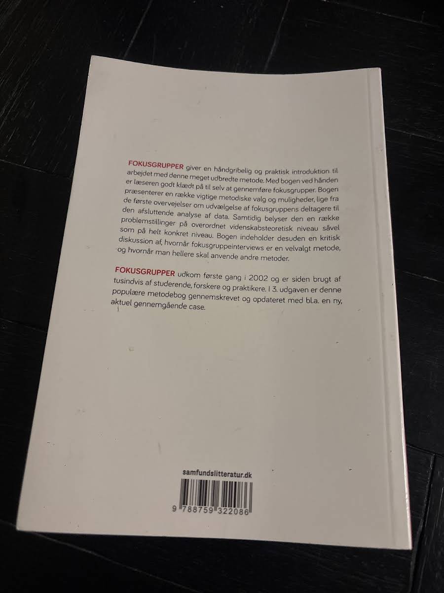 Bente Halkier præsenterer i den 3. udgave af "Fokusgrupper" en klar og praktisk introduktion til fokusgruppeinterviewet som metode. Bogen giver et grundlæggende overblik over de nødvendige beslutninger og metodiske overvejelser, man skal gøre sig fra udvælgelse af deltagere til analysen af de indsamlede data. Med et pædagogisk og anvendelsesorienteret sprog retter denne udgave sig mod både studerende og praktikere, der ønsker at forstå de teoretiske og praktiske aspekter ved fokusgruppeinterviews. Gennem en kritisk drøftelse af metodevalg præsenterer bogen, hvornår fokusgrupper er den optimale tilgang, samt hvilke udfordringer og overvejelser der kan opstå undervejs.