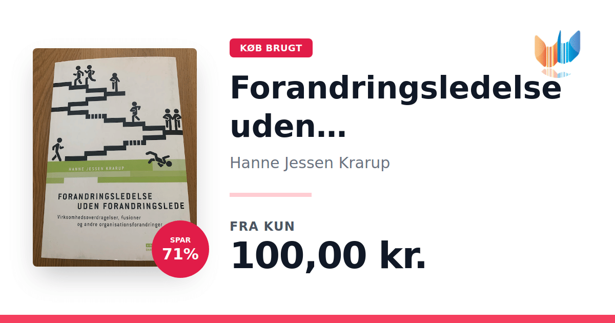 Lige nu kan du købe "Forandringsledelse uden forandringslede" af Hanne Jessen Krarup til kun 100,00 kr. Du sparer hele 71% af nyprisen! Bogen du ser her er brugt, og i god stand. Vi har i øjeblikket 2 eksemplarer til salg af "Forandringsledelse uden forandringslede", så husk at se de forskellige udgaver.