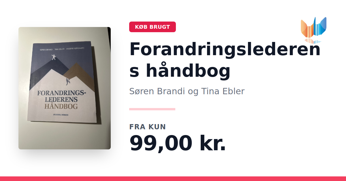 Lige nu kan du købe "Forandringslederens håndbog" af Søren Brandi og Tina Ebler til kun 99,00 kr. Bogen du ser her er brugt, og i perfekt stand. Vi har i øjeblikket kun et enkelt eksemplar til salg af "Forandringslederens håndbog", så slå til mens du kan!