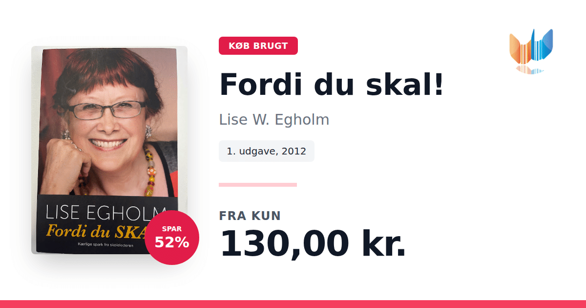 Lige nu kan du købe "Fordi du skal!" af Lise W. Egholm til kun 130,00 kr. Du sparer hele 52% af nyprisen! Bogen du ser her er brugt, og i perfekt stand. Vi har i øjeblikket kun et enkelt eksemplar til salg af "Fordi du skal!", så slå til mens du kan!