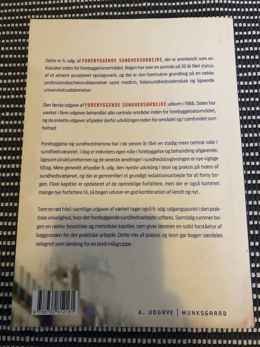 Forebyggende sundhedsarbejde er en anerkendt lærebog, der siden sin første udgivelse i 1986 har markeret sig som et centralt opslagsværk inden for forebyggelsesområdet. I denne sjette udgave, udgivet i 2016 af Gyldendal, reflekteres den nyeste udvikling inden for sundhedsvæsenet både i teori og praksis. Bogen dykker ned i de praktiske realiteter, hvor forebyggende sundhedsarbejde udfolder sig, og tilbyder en kombination af teoretiske og metodiske kapitler. Med bidrag fra både de oprindelige forfattere og nye stemmer formår værket at levere en solid baggrundsforståelse, der gør det til et uundværligt redskab for en bred målgruppe blandt sundhedsprofessionelle og studerende.