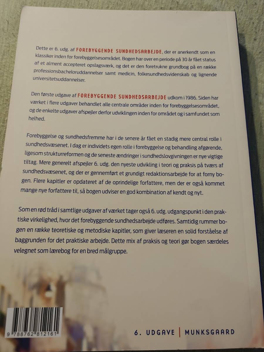 Forebyggende sundhedsarbejde er en anerkendt lærebog, der siden sin første udgivelse i 1986 har markeret sig som et centralt opslagsværk inden for forebyggelsesområdet. I denne sjette udgave, udgivet i 2016 af Gyldendal, reflekteres den nyeste udvikling inden for sundhedsvæsenet både i teori og praksis. Bogen dykker ned i de praktiske realiteter, hvor forebyggende sundhedsarbejde udfolder sig, og tilbyder en kombination af teoretiske og metodiske kapitler. Med bidrag fra både de oprindelige forfattere og nye stemmer formår værket at levere en solid baggrundsforståelse, der gør det til et uundværligt redskab for en bred målgruppe blandt sundhedsprofessionelle og studerende.