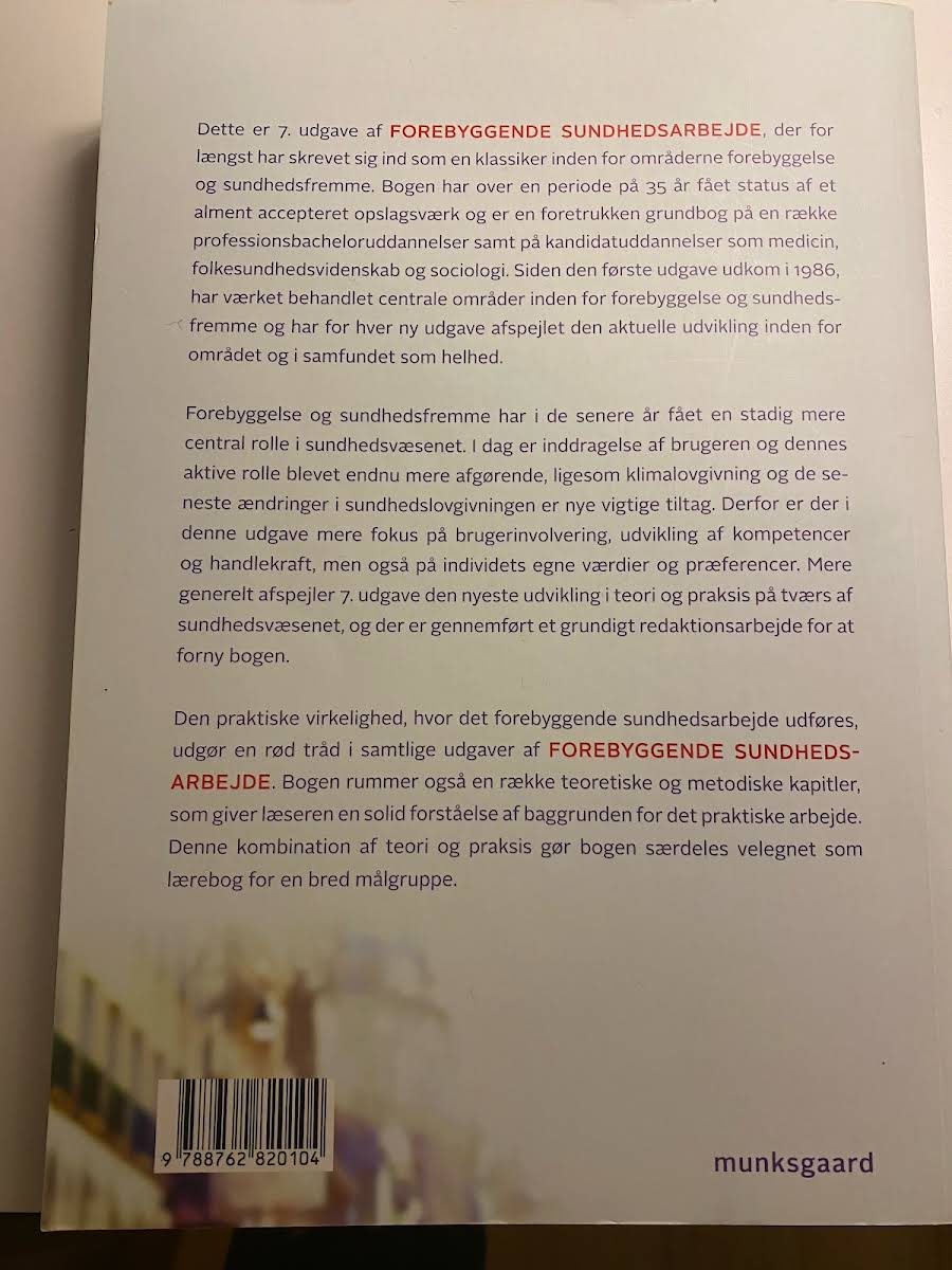 Forebyggende sundhedsarbejde i 7. udgave er et solidt og anerkendt opslagsværk inden for forebyggelse og sundhedsfremme. Med rødder helt tilbage til den første udgave i 1986 har bogen over 35 år opnået status som en klassiker, der dækker de centrale områder i feltet og fungerer som en foretrukken grundbog for både professionsbachelor- og kandidatuddannelser, herunder medicin, folkesundhedsvidenskab og sociologi. Denne udgave afspejler den seneste udvikling i sundhedsvæsenet med et øget fokus på brugerinvolvering, kompetenceudvikling og individets værdier. I takt med nye tiltag som klimalovgivning og ændringer i sundhedslovgivningen er der foretaget et grundigt redaktionsarbejde for at opdatere teorien og praksis inden for området. Med en kombination af praktiske cases og teoretiske samt metodiske kapitler giver bogen læseren et solidt fundament for at forstå og anvende det forebyggende sundhedsarbejde i forskellige sammenhænge.