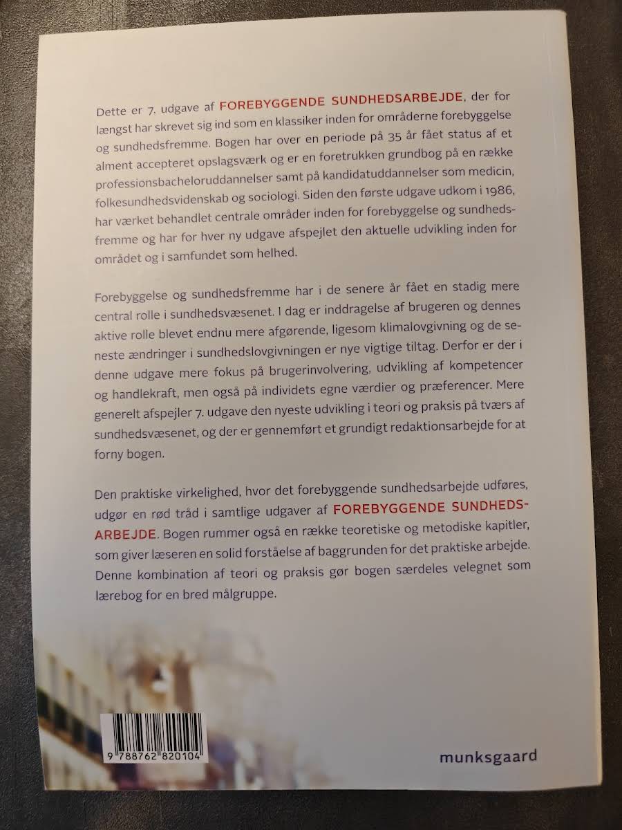 Forebyggende sundhedsarbejde i 7. udgave er et solidt og anerkendt opslagsværk inden for forebyggelse og sundhedsfremme. Med rødder helt tilbage til den første udgave i 1986 har bogen over 35 år opnået status som en klassiker, der dækker de centrale områder i feltet og fungerer som en foretrukken grundbog for både professionsbachelor- og kandidatuddannelser, herunder medicin, folkesundhedsvidenskab og sociologi. Denne udgave afspejler den seneste udvikling i sundhedsvæsenet med et øget fokus på brugerinvolvering, kompetenceudvikling og individets værdier. I takt med nye tiltag som klimalovgivning og ændringer i sundhedslovgivningen er der foretaget et grundigt redaktionsarbejde for at opdatere teorien og praksis inden for området. Med en kombination af praktiske cases og teoretiske samt metodiske kapitler giver bogen læseren et solidt fundament for at forstå og anvende det forebyggende sundhedsarbejde i forskellige sammenhænge.