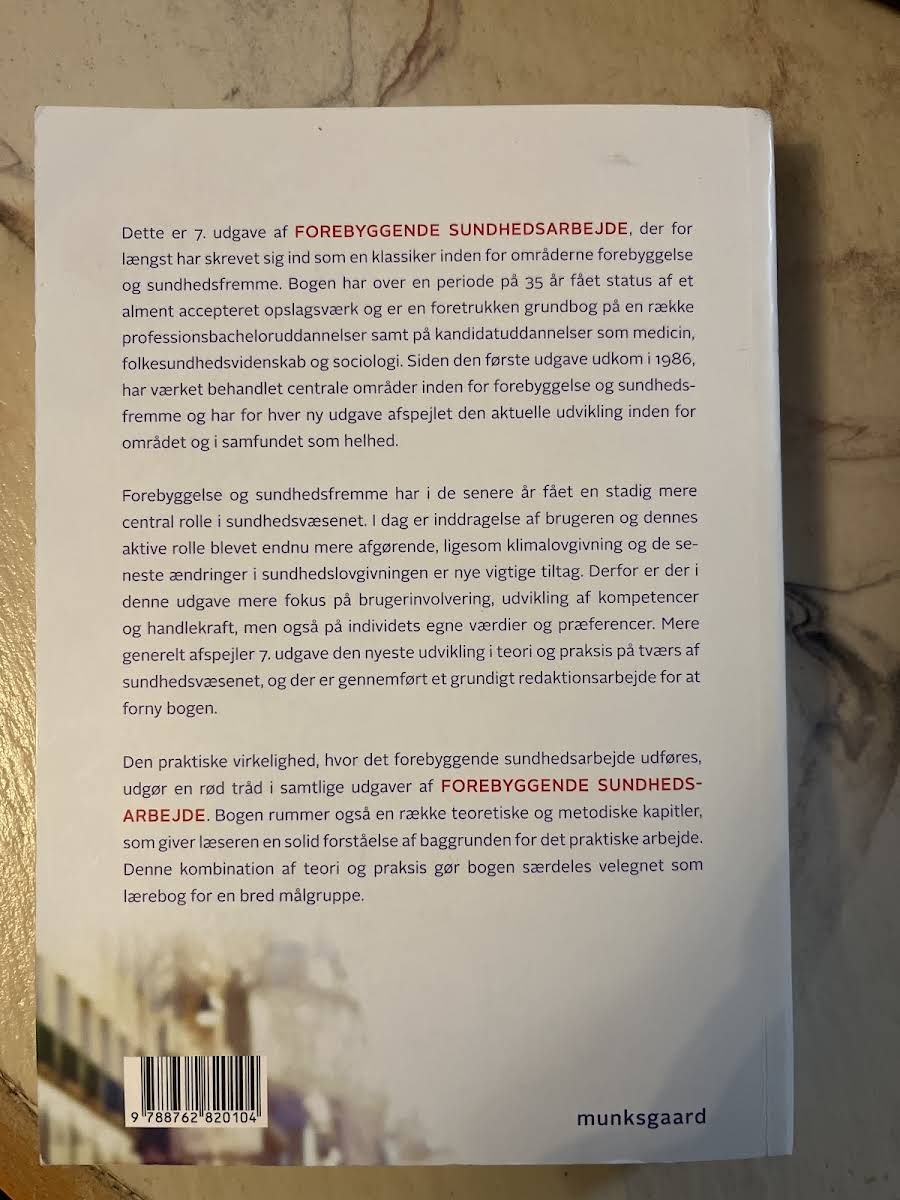 Forebyggende sundhedsarbejde i 7. udgave er et solidt og anerkendt opslagsværk inden for forebyggelse og sundhedsfremme. Med rødder helt tilbage til den første udgave i 1986 har bogen over 35 år opnået status som en klassiker, der dækker de centrale områder i feltet og fungerer som en foretrukken grundbog for både professionsbachelor- og kandidatuddannelser, herunder medicin, folkesundhedsvidenskab og sociologi. Denne udgave afspejler den seneste udvikling i sundhedsvæsenet med et øget fokus på brugerinvolvering, kompetenceudvikling og individets værdier. I takt med nye tiltag som klimalovgivning og ændringer i sundhedslovgivningen er der foretaget et grundigt redaktionsarbejde for at opdatere teorien og praksis inden for området. Med en kombination af praktiske cases og teoretiske samt metodiske kapitler giver bogen læseren et solidt fundament for at forstå og anvende det forebyggende sundhedsarbejde i forskellige sammenhænge.