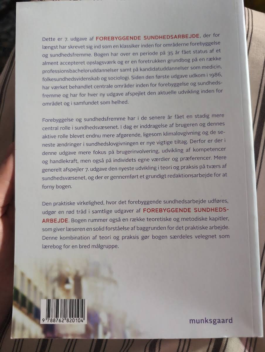 Forebyggende sundhedsarbejde i 7. udgave er et solidt og anerkendt opslagsværk inden for forebyggelse og sundhedsfremme. Med rødder helt tilbage til den første udgave i 1986 har bogen over 35 år opnået status som en klassiker, der dækker de centrale områder i feltet og fungerer som en foretrukken grundbog for både professionsbachelor- og kandidatuddannelser, herunder medicin, folkesundhedsvidenskab og sociologi. Denne udgave afspejler den seneste udvikling i sundhedsvæsenet med et øget fokus på brugerinvolvering, kompetenceudvikling og individets værdier. I takt med nye tiltag som klimalovgivning og ændringer i sundhedslovgivningen er der foretaget et grundigt redaktionsarbejde for at opdatere teorien og praksis inden for området. Med en kombination af praktiske cases og teoretiske samt metodiske kapitler giver bogen læseren et solidt fundament for at forstå og anvende det forebyggende sundhedsarbejde i forskellige sammenhænge.