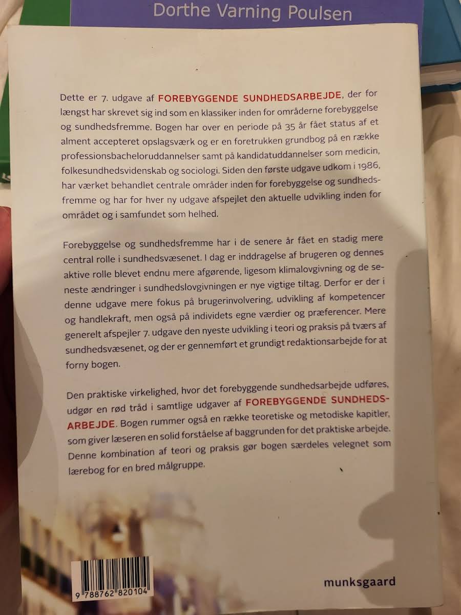 Forebyggende sundhedsarbejde i 7. udgave er et solidt og anerkendt opslagsværk inden for forebyggelse og sundhedsfremme. Med rødder helt tilbage til den første udgave i 1986 har bogen over 35 år opnået status som en klassiker, der dækker de centrale områder i feltet og fungerer som en foretrukken grundbog for både professionsbachelor- og kandidatuddannelser, herunder medicin, folkesundhedsvidenskab og sociologi. Denne udgave afspejler den seneste udvikling i sundhedsvæsenet med et øget fokus på brugerinvolvering, kompetenceudvikling og individets værdier. I takt med nye tiltag som klimalovgivning og ændringer i sundhedslovgivningen er der foretaget et grundigt redaktionsarbejde for at opdatere teorien og praksis inden for området. Med en kombination af praktiske cases og teoretiske samt metodiske kapitler giver bogen læseren et solidt fundament for at forstå og anvende det forebyggende sundhedsarbejde i forskellige sammenhænge.