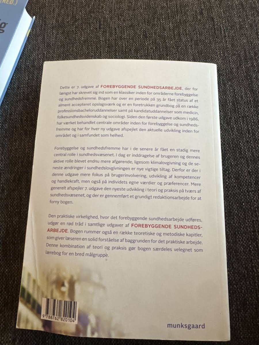 Forebyggende sundhedsarbejde i 7. udgave er et solidt og anerkendt opslagsværk inden for forebyggelse og sundhedsfremme. Med rødder helt tilbage til den første udgave i 1986 har bogen over 35 år opnået status som en klassiker, der dækker de centrale områder i feltet og fungerer som en foretrukken grundbog for både professionsbachelor- og kandidatuddannelser, herunder medicin, folkesundhedsvidenskab og sociologi. Denne udgave afspejler den seneste udvikling i sundhedsvæsenet med et øget fokus på brugerinvolvering, kompetenceudvikling og individets værdier. I takt med nye tiltag som klimalovgivning og ændringer i sundhedslovgivningen er der foretaget et grundigt redaktionsarbejde for at opdatere teorien og praksis inden for området. Med en kombination af praktiske cases og teoretiske samt metodiske kapitler giver bogen læseren et solidt fundament for at forstå og anvende det forebyggende sundhedsarbejde i forskellige sammenhænge.
