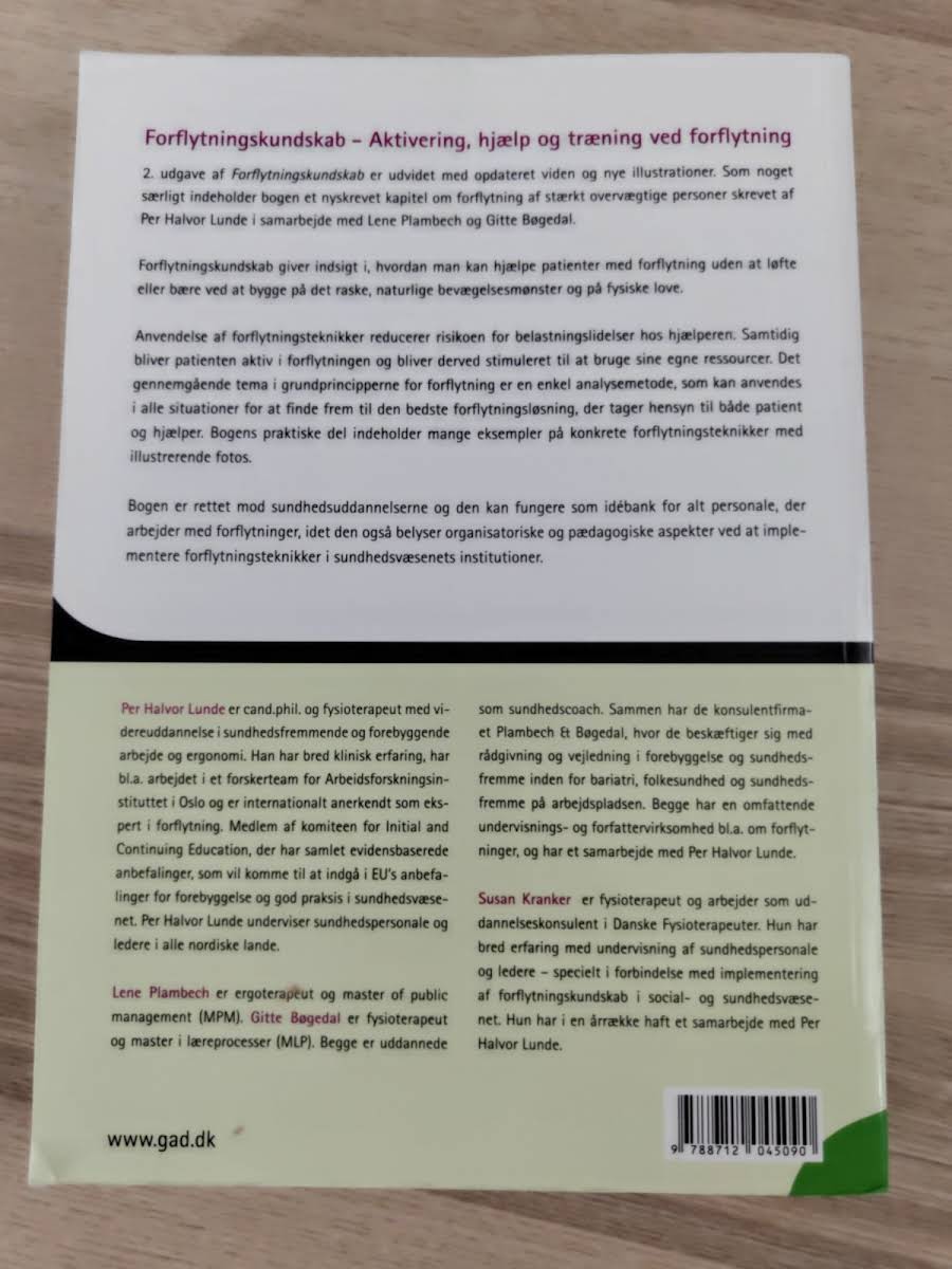 2. udgave af Forflytningskundskab er en grundig og opdateret guide, der belyser vigtigheden af faglig kundskab ved forflytninger. Bogen fokuserer på, hvordan man gennem anvendelsen af naturlige bevægelsesmønstre og fysiske principper kan hjælpe patienter med at blive aktive under forflytningen – uden at skulle løfte eller bære dem – og samtidig mindske risikoen for belastningsskader hos hjælperen. I denne udgave er den seneste viden inden for området blevet indarbejdet, og der er blandt andet tilføjet et nyskrevet kapitel om forflytning af stærkt overvægtige personer. Gennem praktiske eksempler og illustrative fotos giver Forflytningskundskab indsigt i både de teoretiske principper og de praktiske teknikker, der er nødvendige for at sikre en sikker og effektiv forflytning, tilpasset den enkelte patients behov og funktioner. Med fokus på både patientens og hjælperens sikkerhed er denne bog et værdifuldt redskab for undervisning og dagligt arbejde i sundhedssektoren.