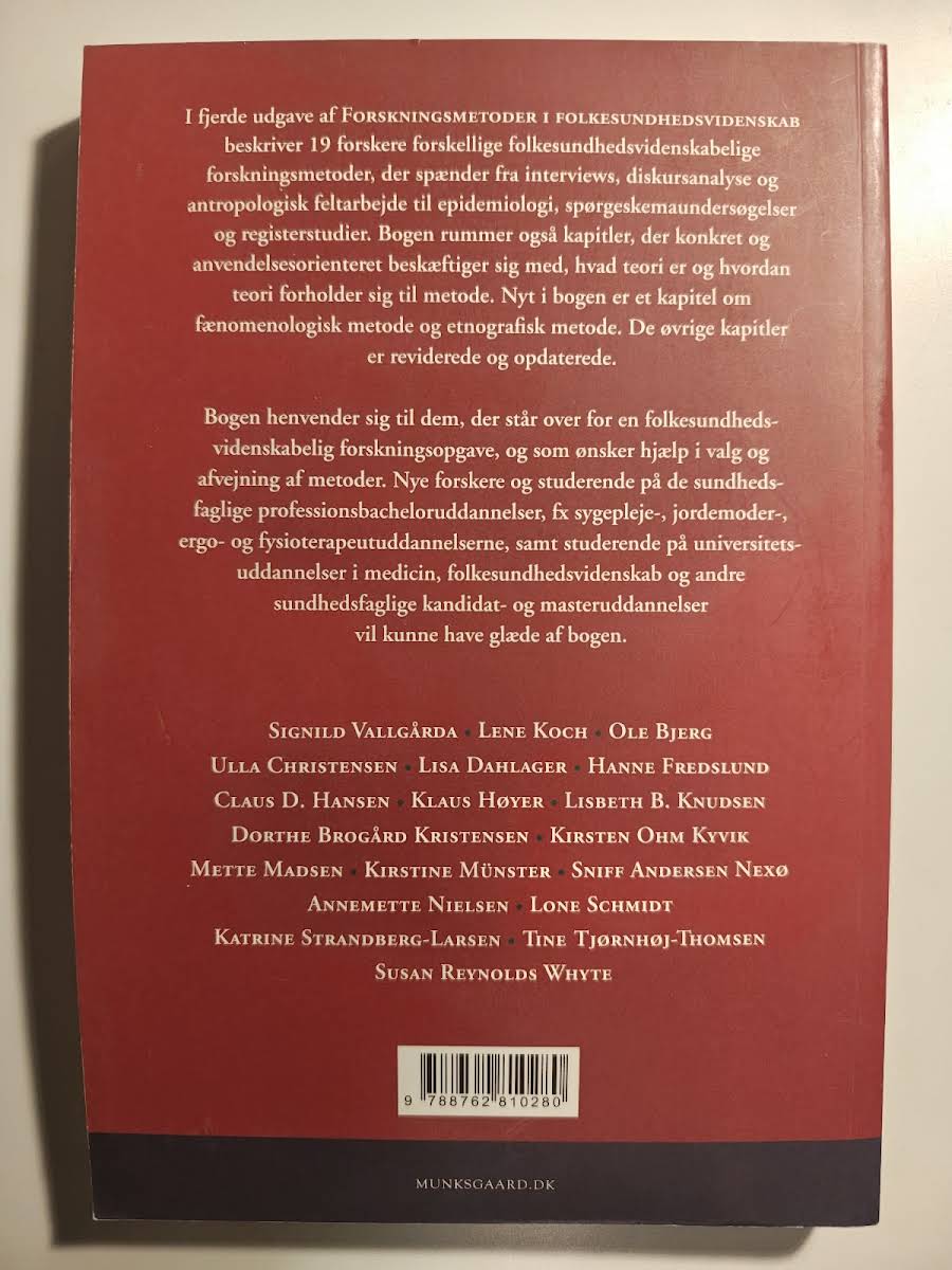I fjerde udgave af Forskningsmetoder i folkesundhedsvidenskab samler 18 erfarne forskere et væld af metoder, der spænder bredt fra interviews og diskursanalyse til antropologisk feltarbejde, epidemiologi, spørgeskemaundersøgelser og registerstudier. Bogen giver en praktisk introduktion til, hvordan teori og metode går hånd i hånd i folkesundhedsvidenskabelig forskning. Et særligt udpluk af kapitler beskæftiger sig med de konkrete anvendelser af teori, mens nye indlæg præsenterer fænomenologisk og etnografisk metode. De øvrige kapitler er både reviderede og opdaterede, så de matcher de nyeste tendenser og krav i forskningsverdenen. Denne bog er et uundværligt redskab for alle, der står i spidsen for en folkesundhedsvidenskabelig forskningsopgave. Den henvender sig til studerende og nye forskere inden for de sundhedsfaglige uddannelser samt på universitetsniveau, og den hjælper med at vælge og afveje de rigtige metoder til opgaven.
