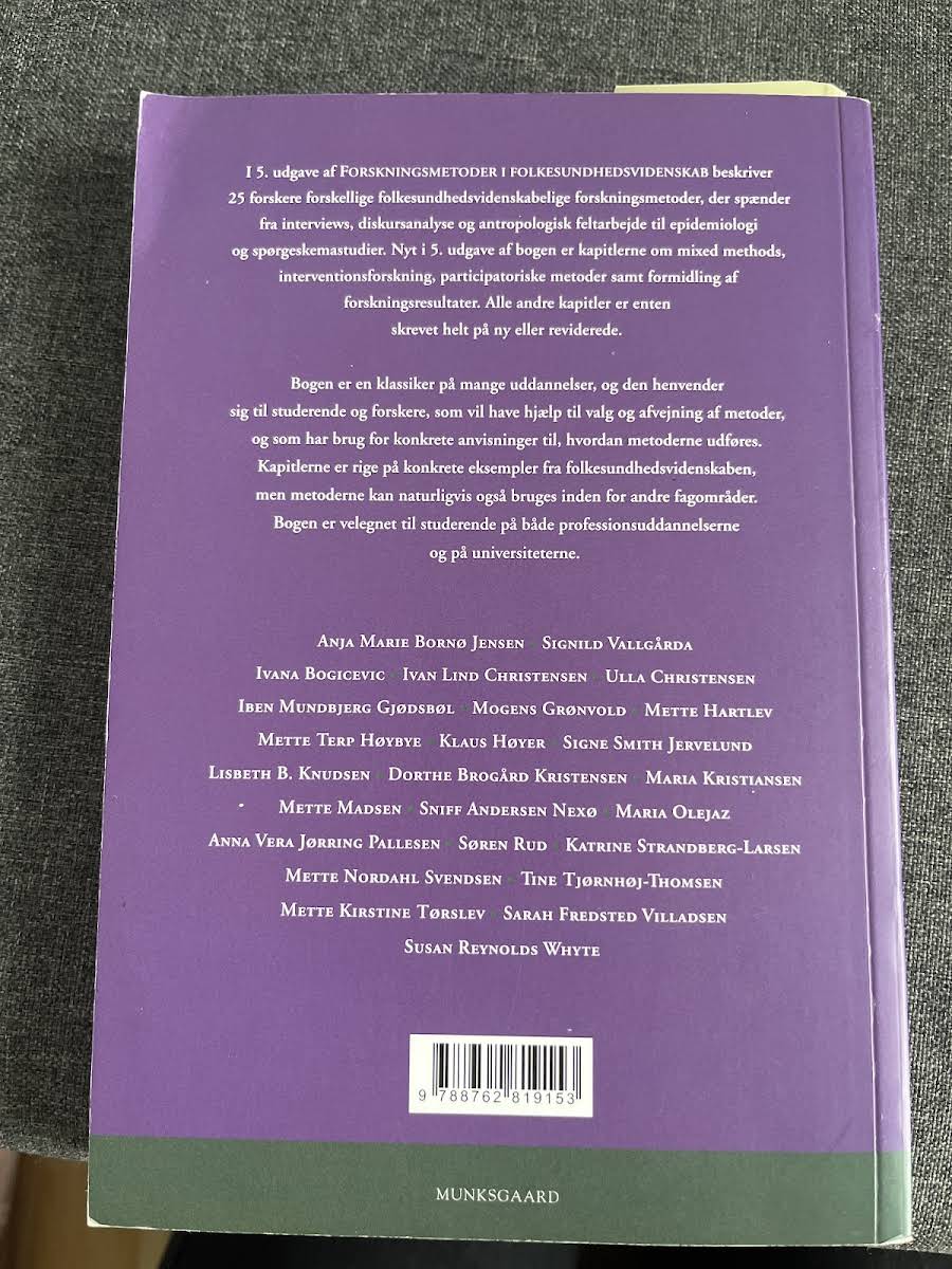 I denne 5. udgave af Forskningsmetoder i folkesundhedsvidenskab, udgivet af Gyldendal i 2019, præsenterer 25 erfarne forskere en bred vifte af metoder, som spænder fra interviews, diskursanalyse og antropologisk feltarbejde til epidemiologi og spørgeskemastudier. Bogen introducerer nye kapitler om mixed methods, interventionsforskning, participatoriske metoder og formidling af forskningsresultater, mens de øvrige afsnit er blevet fuldstændigt revideret eller skrevet på ny. Bogen er et uundværligt redskab for både studerende og forskere, der søger vejledning i valg og anvendelse af metoderne, præsenteret med mange konkrete eksempler fra folkesundhedsvidenskaben. Metodebeskrivelserne kan naturligvis også anvendes inden for andre discipliner, hvilket gør bogen til et alsidigt værktøj på både professions- og universitetsuddannelser.