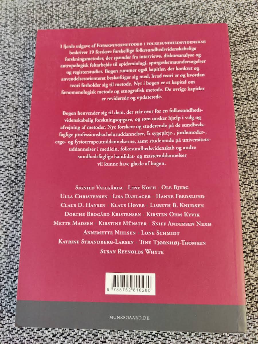 I fjerde udgave af Forskningsmetoder i folkesundhedsvidenskab samler 18 erfarne forskere et væld af metoder, der spænder bredt fra interviews og diskursanalyse til antropologisk feltarbejde, epidemiologi, spørgeskemaundersøgelser og registerstudier. Bogen giver en praktisk introduktion til, hvordan teori og metode går hånd i hånd i folkesundhedsvidenskabelig forskning. Et særligt udpluk af kapitler beskæftiger sig med de konkrete anvendelser af teori, mens nye indlæg præsenterer fænomenologisk og etnografisk metode. De øvrige kapitler er både reviderede og opdaterede, så de matcher de nyeste tendenser og krav i forskningsverdenen. Denne bog er et uundværligt redskab for alle, der står i spidsen for en folkesundhedsvidenskabelig forskningsopgave. Den henvender sig til studerende og nye forskere inden for de sundhedsfaglige uddannelser samt på universitetsniveau, og den hjælper med at vælge og afveje de rigtige metoder til opgaven.