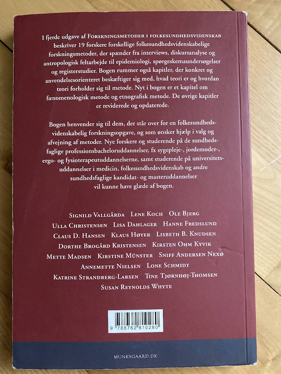 I fjerde udgave af Forskningsmetoder i folkesundhedsvidenskab samler 18 erfarne forskere et væld af metoder, der spænder bredt fra interviews og diskursanalyse til antropologisk feltarbejde, epidemiologi, spørgeskemaundersøgelser og registerstudier. Bogen giver en praktisk introduktion til, hvordan teori og metode går hånd i hånd i folkesundhedsvidenskabelig forskning. Et særligt udpluk af kapitler beskæftiger sig med de konkrete anvendelser af teori, mens nye indlæg præsenterer fænomenologisk og etnografisk metode. De øvrige kapitler er både reviderede og opdaterede, så de matcher de nyeste tendenser og krav i forskningsverdenen. Denne bog er et uundværligt redskab for alle, der står i spidsen for en folkesundhedsvidenskabelig forskningsopgave. Den henvender sig til studerende og nye forskere inden for de sundhedsfaglige uddannelser samt på universitetsniveau, og den hjælper med at vælge og afveje de rigtige metoder til opgaven.
