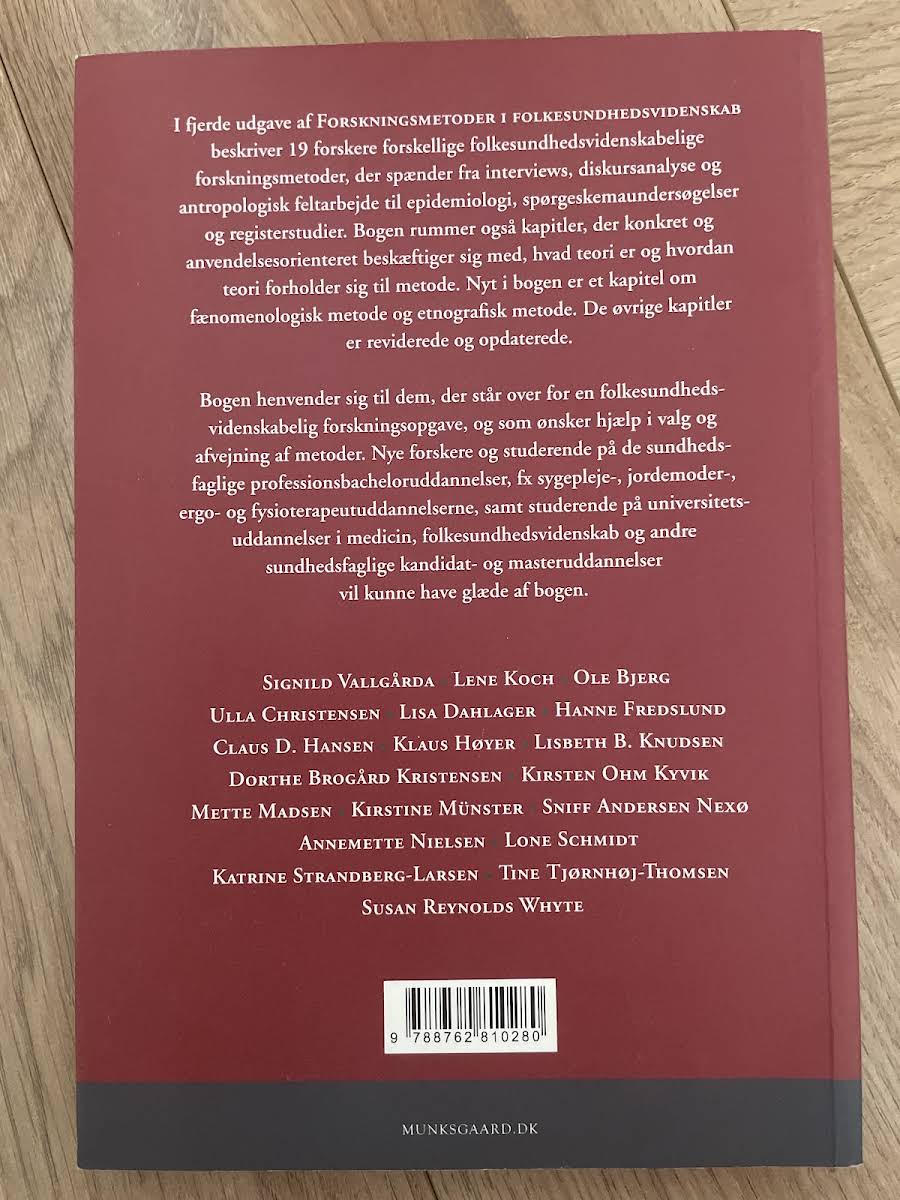 I fjerde udgave af Forskningsmetoder i folkesundhedsvidenskab samler 18 erfarne forskere et væld af metoder, der spænder bredt fra interviews og diskursanalyse til antropologisk feltarbejde, epidemiologi, spørgeskemaundersøgelser og registerstudier. Bogen giver en praktisk introduktion til, hvordan teori og metode går hånd i hånd i folkesundhedsvidenskabelig forskning. Et særligt udpluk af kapitler beskæftiger sig med de konkrete anvendelser af teori, mens nye indlæg præsenterer fænomenologisk og etnografisk metode. De øvrige kapitler er både reviderede og opdaterede, så de matcher de nyeste tendenser og krav i forskningsverdenen. Denne bog er et uundværligt redskab for alle, der står i spidsen for en folkesundhedsvidenskabelig forskningsopgave. Den henvender sig til studerende og nye forskere inden for de sundhedsfaglige uddannelser samt på universitetsniveau, og den hjælper med at vælge og afveje de rigtige metoder til opgaven.