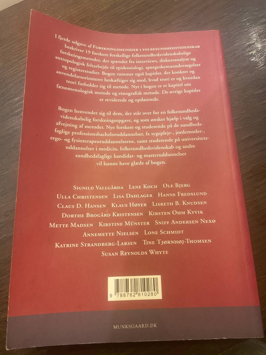 I fjerde udgave af Forskningsmetoder i folkesundhedsvidenskab samler 18 erfarne forskere et væld af metoder, der spænder bredt fra interviews og diskursanalyse til antropologisk feltarbejde, epidemiologi, spørgeskemaundersøgelser og registerstudier. Bogen giver en praktisk introduktion til, hvordan teori og metode går hånd i hånd i folkesundhedsvidenskabelig forskning. Et særligt udpluk af kapitler beskæftiger sig med de konkrete anvendelser af teori, mens nye indlæg præsenterer fænomenologisk og etnografisk metode. De øvrige kapitler er både reviderede og opdaterede, så de matcher de nyeste tendenser og krav i forskningsverdenen. Denne bog er et uundværligt redskab for alle, der står i spidsen for en folkesundhedsvidenskabelig forskningsopgave. Den henvender sig til studerende og nye forskere inden for de sundhedsfaglige uddannelser samt på universitetsniveau, og den hjælper med at vælge og afveje de rigtige metoder til opgaven.
