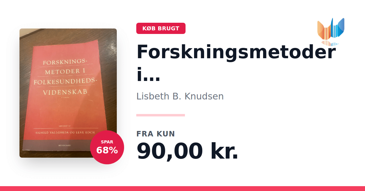 Lige nu kan du købe "Forskningsmetoder i folkesundhedsvidenskab" af Lisbeth B. Knudsen til kun 90,00 kr. Du sparer hele 68% af nyprisen! Bogen du ser her er brugt, og i perfekt stand. Vi har i øjeblikket 9 eksemplarer til salg af "Forskningsmetoder i folkesundhedsvidenskab", så husk at se de forskellige udgaver.