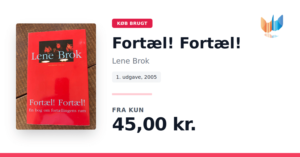 Lige nu kan du købe "Fortæl! Fortæl!" af Lene Brok til kun 45,00 kr. Bogen du ser her er brugt, og i god stand. Vi har i øjeblikket 2 eksemplarer til salg af "Fortæl! Fortæl!", så husk at se de forskellige udgaver.