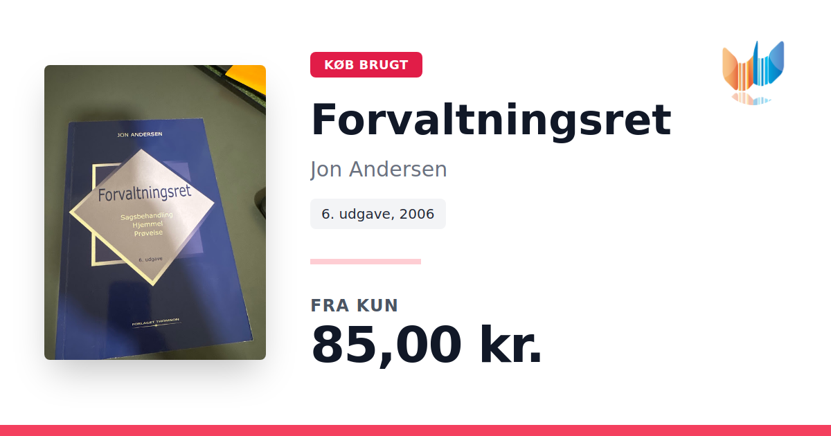 Lige nu kan du købe "Forvaltningsret" af Jon Andersen til kun 85,00 kr. Bogen du ser her er brugt, og i god stand. Vi har i øjeblikket kun et enkelt eksemplar til salg af "Forvaltningsret", så slå til mens du kan!