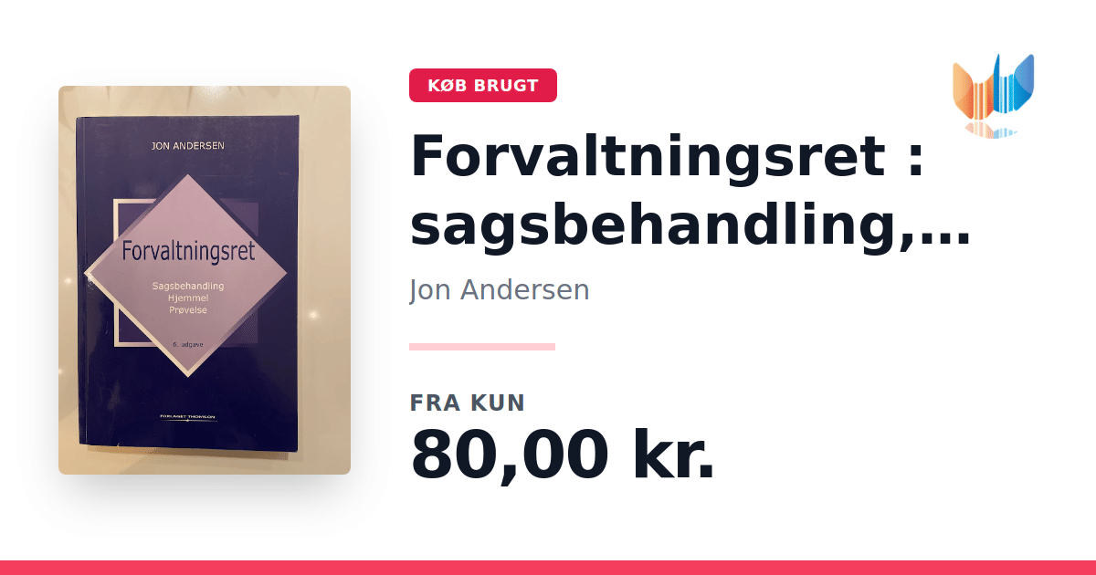Lige nu kan du købe "Forvaltningsret : sagsbehandling, hjemmel, prøvelse" af Jon Andersen til kun 80,00 kr. Bogen du ser her er brugt, og i perfekt stand. Vi har i øjeblikket 2 eksemplarer til salg af "Forvaltningsret : sagsbehandling, hjemmel, prøvelse", så husk at se de forskellige udgaver.