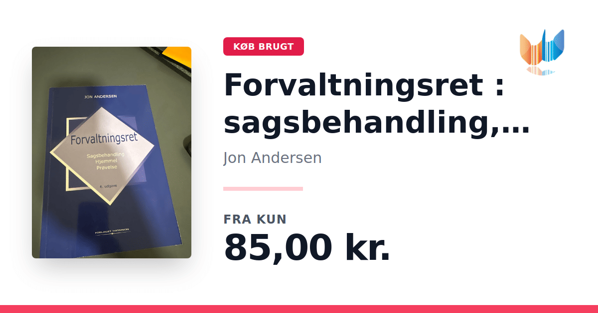 Lige nu kan du købe "Forvaltningsret : sagsbehandling, hjemmel, prøvelse" af Jon Andersen til kun 85,00 kr. Bogen du ser her er brugt, og i god stand. Vi har i øjeblikket 2 eksemplarer til salg af "Forvaltningsret : sagsbehandling, hjemmel, prøvelse", så husk at se de forskellige udgaver.
