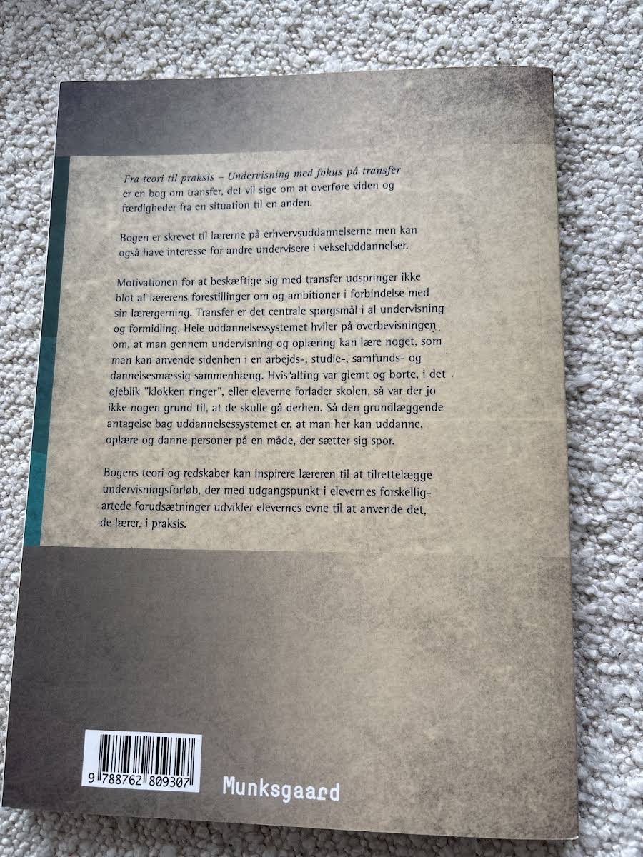 "Fra teori til praksis" af Vibe Aarkrog er en praktisk og anvendelsesorienteret bog, der sætter fokus på, hvordan teori kan omsættes til praksis. Gennem en grundig introduktion til konceptet transfer – evnen til at overføre viden og færdigheder fra et område til et andet – giver bogen både teoretiske indsigter og konkrete redskaber, som kan anvendes til at tilrettelægge undervisningsforløb med udgangspunkt i den enkelte elevs forudsætninger. Bogen retter sig primært mod undervisere på erhvervsuddannelserne, der ønsker at støtte eleverne i at navigere overgangen fra skolens læring til den praktiske virkelighed. Med sine 144 sider tilbyder "Fra teori til praksis" en overskuelig og målrettet tilgang, der hjælper både lærere og elever med at balancere mellem teoretiske koncepter og den praktiske udførelse.