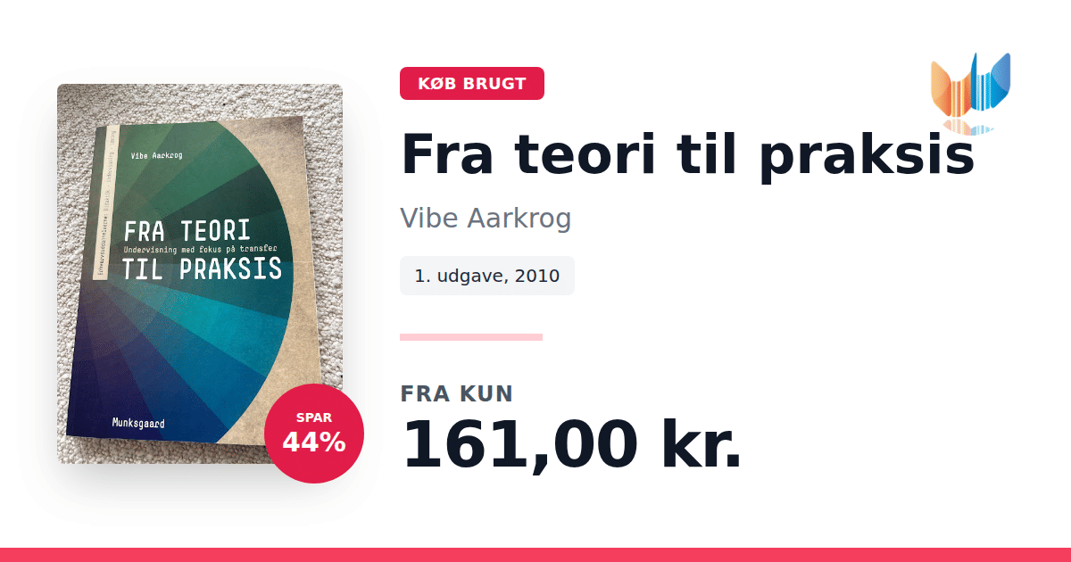 Lige nu kan du købe "Fra teori til praksis" af Vibe Aarkrog til kun 161,00 kr. Du sparer hele 44% af nyprisen! Bogen du ser her er brugt, og i perfekt stand. Vi har i øjeblikket 4 eksemplarer til salg af "Fra teori til praksis", så husk at se de forskellige udgaver.