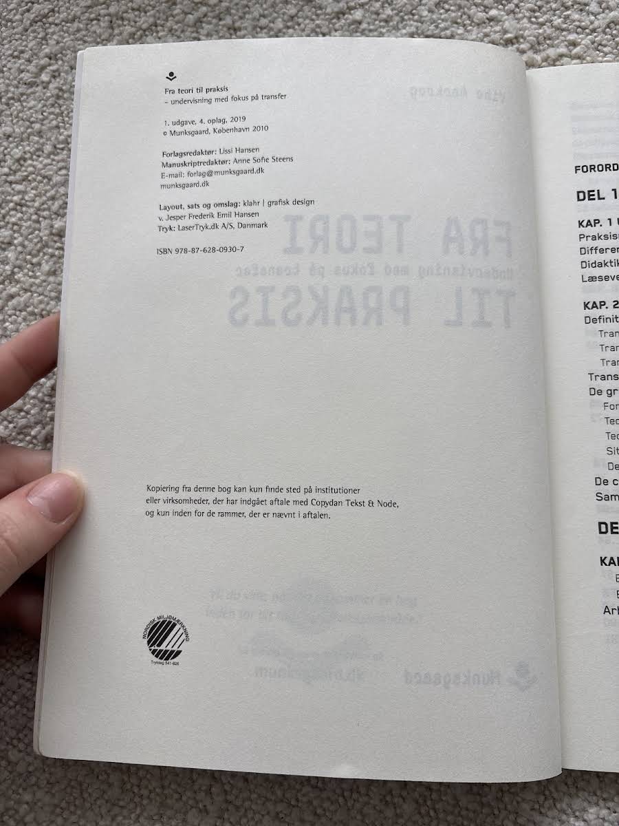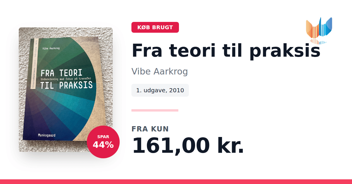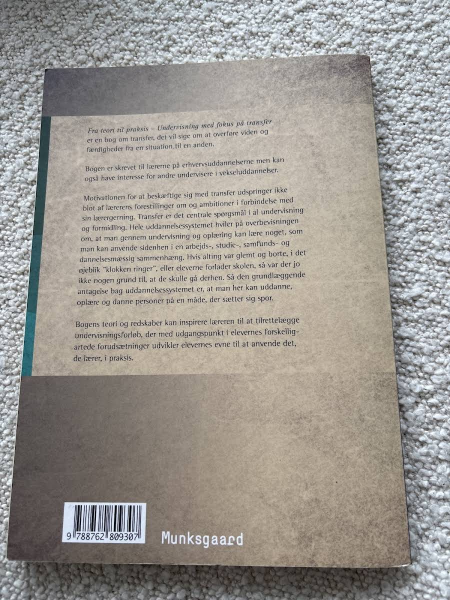 "Fra teori til praksis" af Vibe Aarkrog er en praktisk og anvendelsesorienteret bog, der sætter fokus på, hvordan teori kan omsættes til praksis. Gennem en grundig introduktion til konceptet transfer – evnen til at overføre viden og færdigheder fra et område til et andet – giver bogen både teoretiske indsigter og konkrete redskaber, som kan anvendes til at tilrettelægge undervisningsforløb med udgangspunkt i den enkelte elevs forudsætninger. Bogen retter sig primært mod undervisere på erhvervsuddannelserne, der ønsker at støtte eleverne i at navigere overgangen fra skolens læring til den praktiske virkelighed. Med sine 144 sider tilbyder "Fra teori til praksis" en overskuelig og målrettet tilgang, der hjælper både lærere og elever med at balancere mellem teoretiske koncepter og den praktiske udførelse.