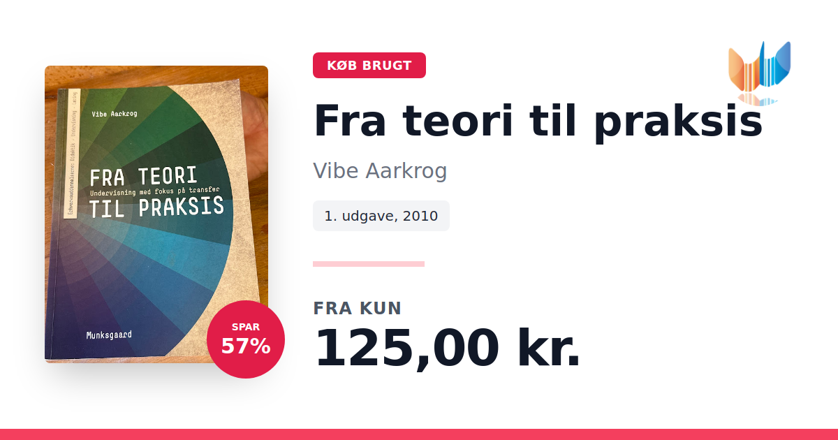 Lige nu kan du købe "Fra teori til praksis" af Vibe Aarkrog til kun 125,00 kr. Du sparer hele 57% af nyprisen! Bogen du ser her er brugt, og i perfekt stand. Vi har i øjeblikket kun et enkelt eksemplar til salg af "Fra teori til praksis", så slå til mens du kan!