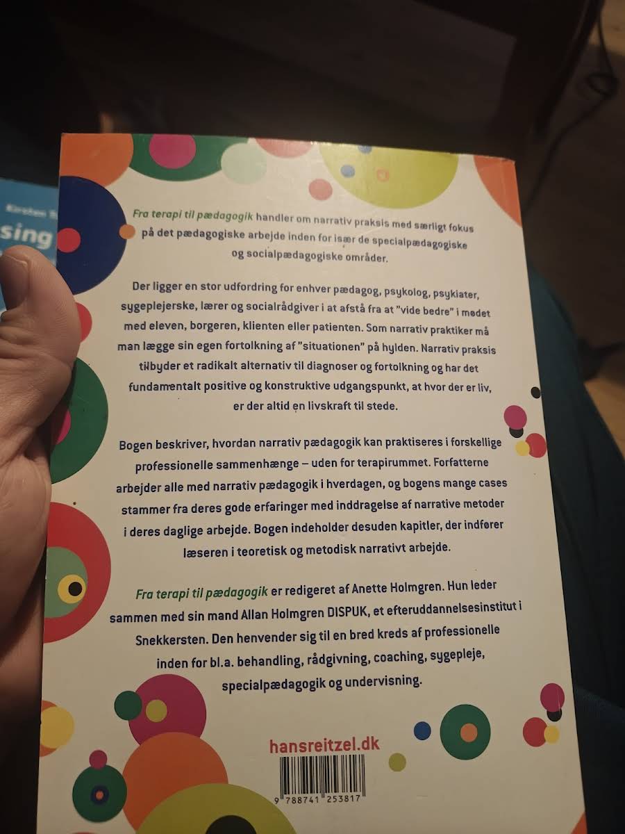 "Fra terapi til pædagogik" udforsker narrativ praksis med et særligt fokus på det pædagogiske arbejde, især inden for de specialpædagogiske og socialpædagogiske områder. Bogen understreger, hvordan pædagoger, psykologer, psykiatere, sygeplejersker, lærere og socialrådgivere gennem narrativt arbejde kan møde livets problemer med en åben og konstruktiv tilgang. Gennem en række nøje udvalgte cases præsenterer forfatterne deres vellykkede erfaringer med inddragelsen af narrative metoder i det daglige virke. Denne praksis opfordrer den professionelle til at lægge egne fortolkninger til side og i stedet møde den enkelte med fokus på, at hvor der er liv, er der også en livskraft, der kan styrke den enkeltes potentiale. Bogen indeholder desuden kapitler, der introducerer læseren til både teoretiske og metodiske aspekter af narrativt arbejde. Med sin klare og inspirerende fremstilling viser "Fra terapi til pædagogik", hvordan narrativ pædagogik kan fungere som et værdifuldt alternativ til standardiserede diagnoser og fortolkningsrammer.