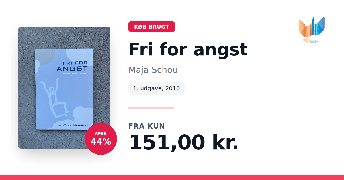 Lige nu kan du købe "Fri for angst" af Maja Schou til kun 151,00 kr. Du sparer hele 44% af nyprisen! Bogen du ser her er brugt, og i perfekt stand. Vi har i øjeblikket kun et enkelt eksemplar til salg af "Fri for angst", så slå til mens du kan!