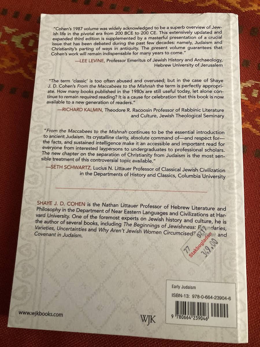 Fra makkabæerne til Mishnaen præsenterer i sin tredje udgave Shaye J. D. Cohens afgørende studie af jødedommens udvikling mellem 164 fvt. og 300 evt. Dette værk forener religion, litteratur og historie i en sammenhængende fremstilling, der skaber dyb indsigt i periodens centrale spørgsmål. Cohen undersøger forholdet mellem jøder og ikke-jøder, jødedommens rolle i det bredere samfund samt fremvæksten af normativ jødedom og forskellige jødiske sekter. Han giver læseren en forståelse af de sociale og kulturelle rammer, som banede vej for rabbinisk jødedom. Den tredje udgave indeholder endvidere et nyt kapitel om adskillelsen mellem jødedom og kristendom i det 2. århundrede evt. Fra makkabæerne til Mishnaen forbliver den klareste introduktion til den æra, der formede jødedommen og lagde grundlaget for tidlig kristendom.