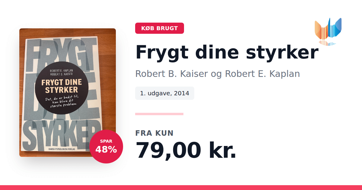 Lige nu kan du købe "Frygt dine styrker" af Robert B. Kaiser og Robert E. Kaplan til kun 79,00 kr. Du sparer hele 48% af nyprisen! Bogen du ser her er brugt, og i perfekt stand. Vi har i øjeblikket 2 eksemplarer til salg af "Frygt dine styrker", så husk at se de forskellige udgaver.