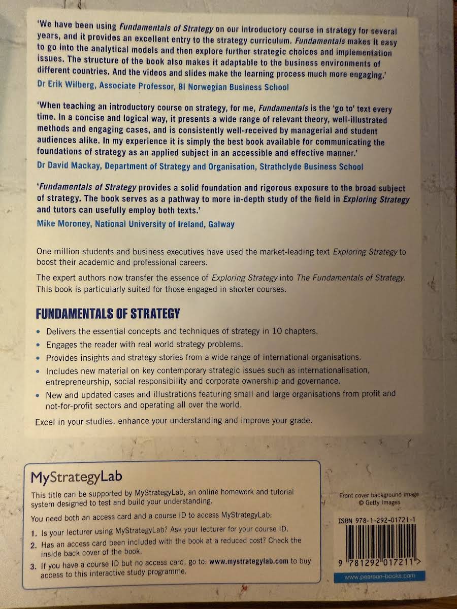 Mere end en million studerende og erhvervsledere har allerede benyttet sig af det anerkendte Exploring Strategy, og nu har forfatterne Gerry Johnson, Richard Whittington, Kevan Scholes, Patrick Regnèr og Duncan Angwin destilleret kernen af deres arbejde i Fundamentals of Strategy. Denne tredje udgave giver et skarpt, men alligevel fyldestgørende overblik over centrale strategimodeller, analyser og beslutningsværktøjer. Med sine 304 sider i praktisk paperbackformat er Fundamentals of Strategy særligt velegnet til kortere uddannelsesforløb, ledelseskurser og studerende, der ønsker en koncentreret introduktion til strategiske processer. Sproget er klart og tilgængeligt, og de gennemgående eksempler gør det nemt at omsætte teori til praksis.