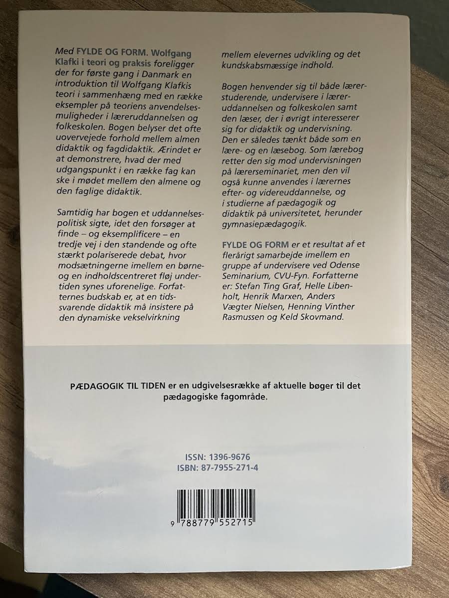 Fylde og form byder læseren velkommen til en dybdegående introduktion til Wolfgang Klafkis didaktiske teori, der for første gang bringes i spil i Danmark. Bogen demonstrerer, hvordan Klafkis tanker kan omsættes i praksis med eksempler fra læreruddannelsen og folkeskolens virkelighed, og viser potentielle krydsfelter mellem almen didaktik og fagdidaktik. Med et klart uddannelsespolitisk sigte udforsker forfatterne, hvordan en harmonisk forening af elevudvikling og det faglige indhold kan være med til at bane vejen for en tredje vej i den ofte polariserede debat mellem børne- og indholdscentrerede tilgange. Denne første udgave af Fylde og form vækker refleksion og inspiration hos både undervisere og studerende, og understreger nødvendigheden af en dynamisk vekselvirkning mellem de pædagogiske metoder.