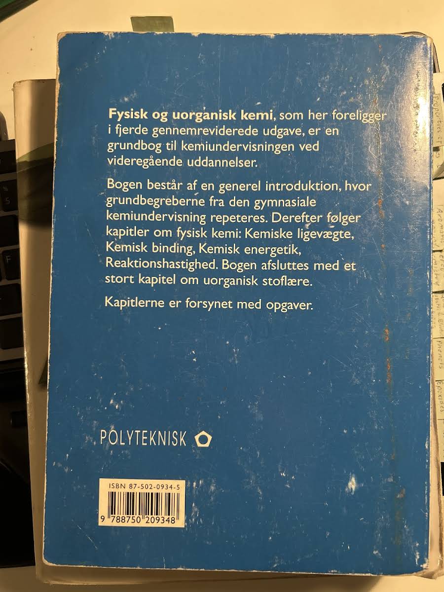 Fysisk og uorganisk kemi er en grundbog til kemiundervisningen på videregående uddannelser, der på 414 sider tilbyder en systematisk gennemgang af de centrale principper inden for både fysisk og uorganisk kemi. Bogen begynder med en introduktion, hvor de grundlæggende begreber fra gymnasiets kemiundervisning kortlægges, inden den bevæger sig dybere ind i stoffets kerne med kapitler om blandt andet kemiske ligevægte, kemisk binding, kemisk energetik samt reaktionshastighed. Bogen runder emnet af med et omfattende afsnit om uorganisk stoflære, og hvert kapitel understøttes af opgaver, der fremmer forståelsen af stoffets teoretiske og praktiske aspekter. Udgivet i 2003 af Polyteknisk Forlag og skrevet af Erik Larsen og Hans Erik Lundager Madsen, gør denne bog sig til et væsentligt redskab for både studerende og undervisere i kemifaget.