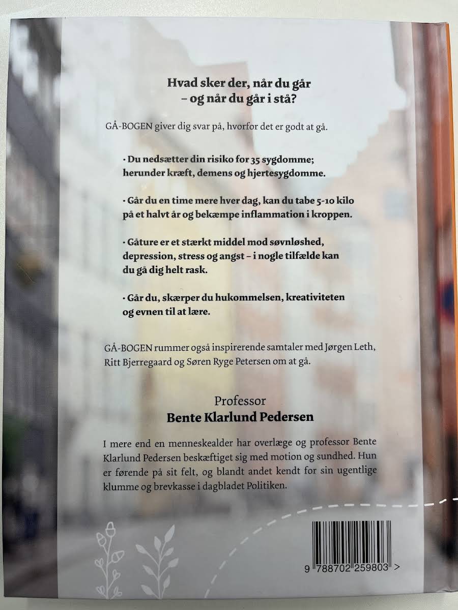Hvad sker der, når du går – og når du går i stå? GÅ-BOGEN giver dig svar på, hvorfor det er godt at gå. GÅ-BOGEN rummer også inspirerende samtaler med Jørgen Leth, Ritt Bjerregaard og Søren Ryge Petersen om at gå. • Du nedsætter din risiko for 35 sygdomme; herunder kræft, demens og hjertesygdomme. • Går du en time mere hver dag, kan du tabe 5-10 kilo på et halvt år og bekæmper inflammation i kroppen.