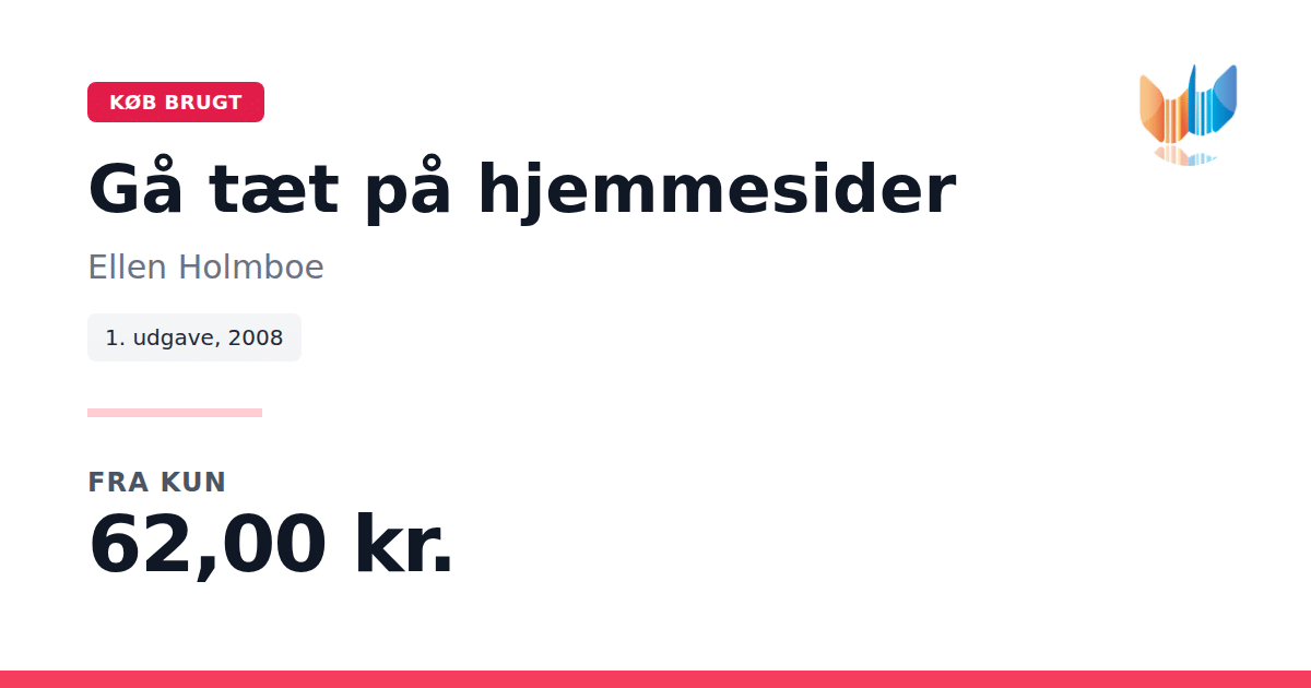 Lige nu kan du købe "Gå tæt på hjemmesider" af Ellen Holmboe til kun 62,00 kr. Bogen du ser her er brugt, og i god stand. Vi har i øjeblikket kun et enkelt eksemplar til salg af "Gå tæt på hjemmesider", så slå til mens du kan!