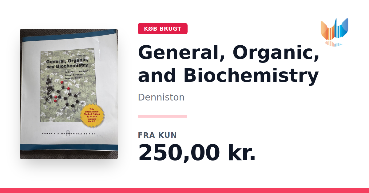 Lige nu kan du købe "General, Organic, and Biochemistry" af Denniston til kun 250,00 kr. Bogen du ser her er brugt, og i god stand. Vi har i øjeblikket 2 eksemplarer til salg af "General, Organic, and Biochemistry", så husk at se de forskellige udgaver.
