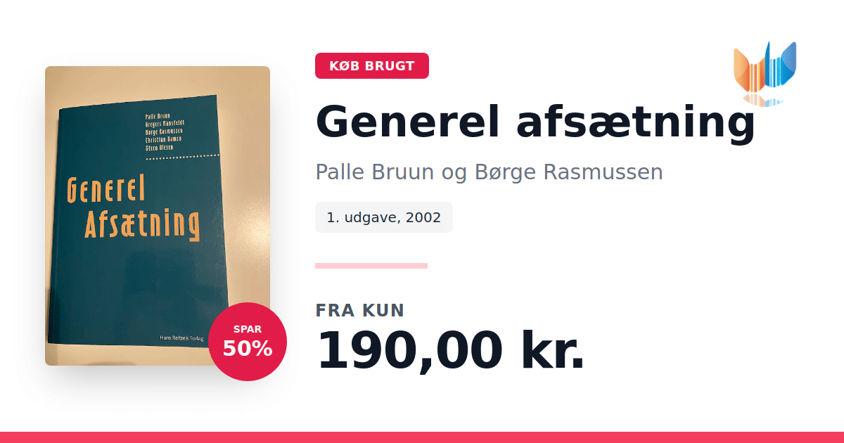 Lige nu kan du købe "Generel afsætning" af Palle Bruun og Børge Rasmussen til kun 190,00 kr. Du sparer hele 50% af nyprisen! Bogen du ser her er brugt, og i perfekt stand. Vi har i øjeblikket 2 eksemplarer til salg af "Generel afsætning", så husk at se de forskellige udgaver.