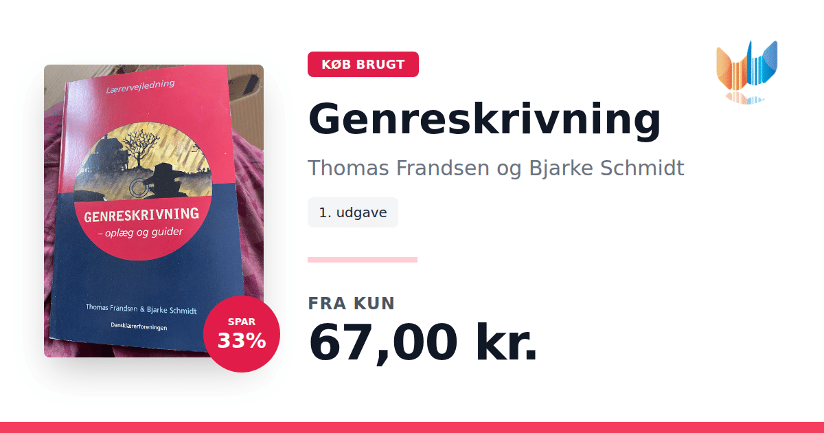 Lige nu kan du købe "Genreskrivning" af Thomas Frandsen og Bjarke Schmidt til kun 67,00 kr. Du sparer hele 33% af nyprisen! Bogen du ser her er brugt, og i god stand. Vi har i øjeblikket 2 eksemplarer til salg af "Genreskrivning", så husk at se de forskellige udgaver.