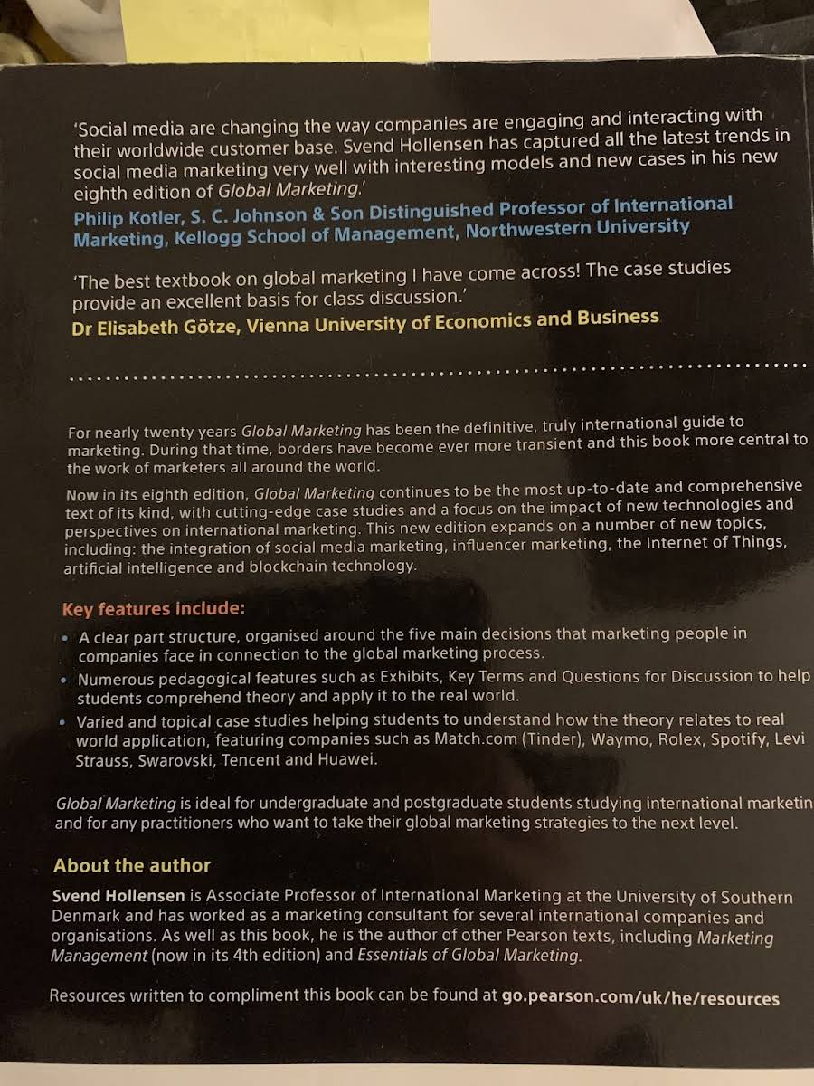 Global Marketing, 8th Edition, by Svend Hollensen presents a comprehensive guide to international marketing that has shaped the field for nearly two decades. Now updated for 2020, this textbook offers both undergraduate and postgraduate students - as well as marketing professionals - a robust framework for understanding and applying the complex processes behind global marketing decisions. The book is meticulously structured around the five key decisions that marketing executives face when operating on the global stage. Enhanced with numerous pedagogical tools such as Exhibits, Key Terms, and Discussion Questions, each chapter is designed to bridge theory with real-world application. End-of-chapter and end-of-part case studies further illustrate how foundational concepts are implemented in practice. In this edition, readers will find contemporary case studies and fresh insights into the latest technological trends and practices shaping international marketing today - including topics like artificial intelligence, the shared economy, subscription-based pricing, and omnichannel strategies. Global Marketing remains an indispensable resource for anyone looking to elevate their understanding and execution of marketing strategies in today’s dynamic global environment.