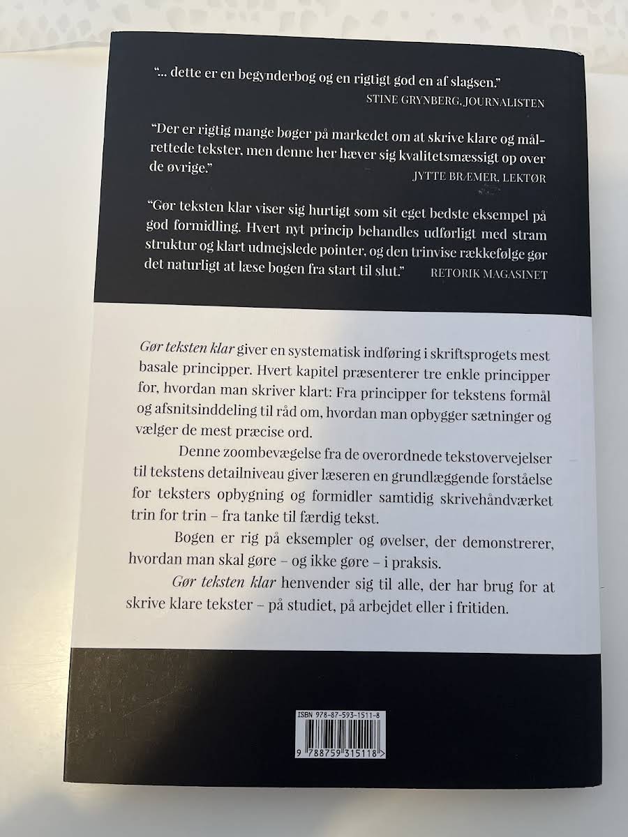 Christina Pontoppidans "Gør teksten klar" tilbyder en struktureret tilgang til skriftsprog og hjælper læseren med at mestre tekstens opbygning. Bogen fører gennem hele skriveprocessen og giver konkrete, trin-for-trin-anvisninger, der gør det nemt at følge med – fra de grundlæggende overvejelser omkring tekstens formål til de finere detaljer i tekstens opbygning. Med fokus på både teksten som helhed og de enkelte sætningers opbygning, afslører bogen de centrale principper for et klart og præcist sprog. Uanset om man skriver i arbejds-, studie- eller fritidssammenhæng, bliver læserens forståelse for skrivning styrket gennem praktiske råd og systematisk formidling af skrivehåndværket.