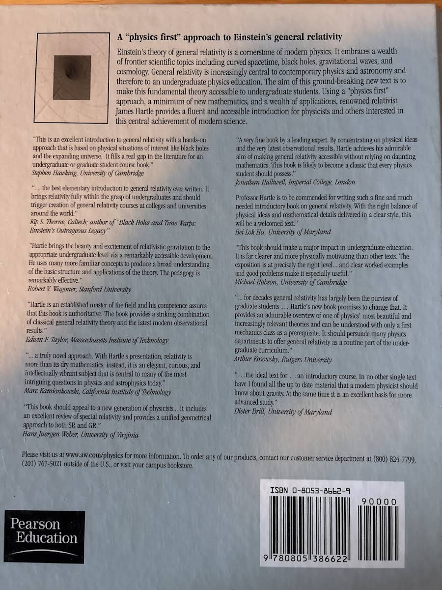 Gravity - An Introduction to Einstein’s General Relativity af James Hartle (2002) er en grundig og tilgængelig introduktion til generalrelativitet, udgivet af Pearson Education i en smuk hardcover-udgave på 608 sider. Med en "fysik først"-metode præsenteres de væsentligste begreber med et minimum af ny matematik, så alle fysikstuderende kan følge med. Gennem en række fængende eksempler demonstreres, hvordan Einsteins teori beskriver både dagligdags og ekstreme fænomener. GPS-systemet, sorte huller, røntgenkilder, pulsarer og kvasarer bruges som konkrete cases, der levendegør rumtidens krumning og dens konsekvenser. Bogen binder teori og observation tæt sammen og fører læseren fra gravitationsbølger til universets begyndelse ved Big Bang og videre til kosmos’ store struktur. Et uundværligt værk for alle, der ønsker en solid, men ikke overvældende, forståelse af gravitationsfysikken.