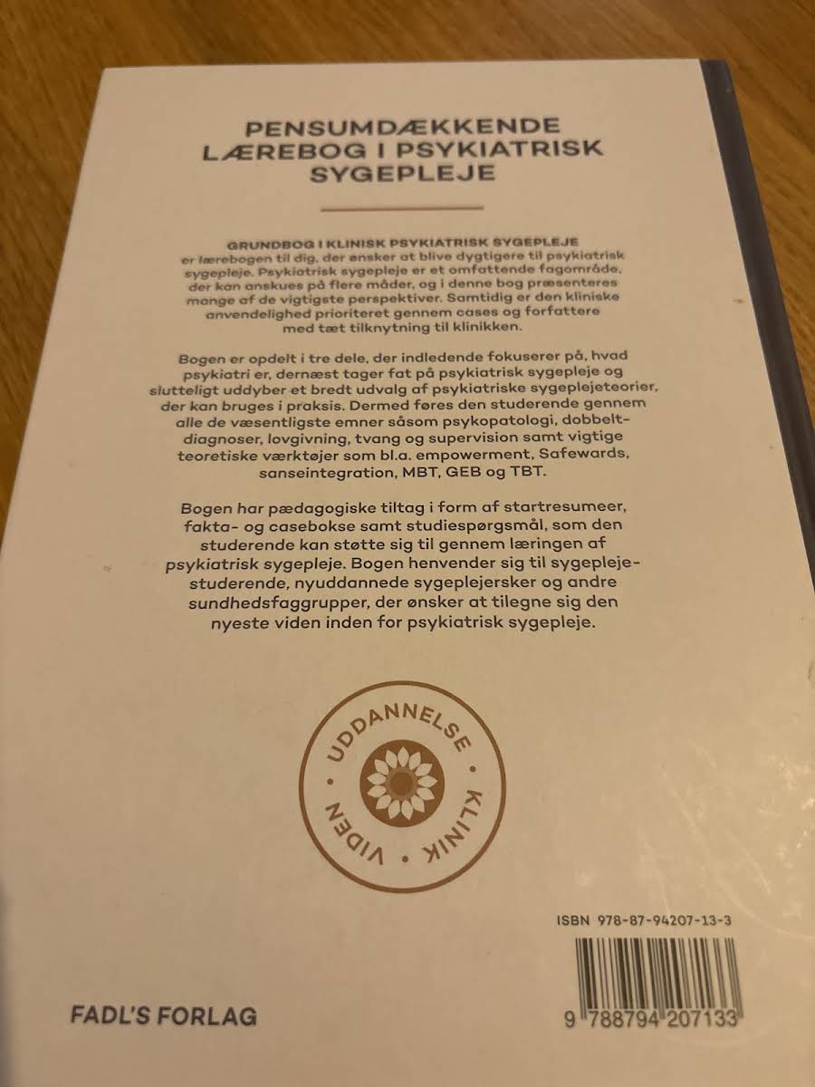 Grundbog i klinisk psykiatrisk sygepleje præsenterer psykiatrisk sygepleje i et bredt perspektiv med fokus på den kliniske anvendelighed. Gennem autentiske cases og forfattere med tæt tilknytning til praksis sikres en umiddelbar kobling mellem teori og hverdagens udfordringer. Bogen er struktureret i tre dele, der først introducerer psykiatriens rammer og struktur, herefter sætter fokus på den kliniske sygeplejeindsats og til sidst udfolder centrale psykiatriske sygeplejeteorier. Emner som psykopatologi, dobbeltdiagnoser, lovgivning, tvang og supervision gennemgås grundigt, og teoriopsætningen understøttes af nøgleværktøjer som empowerment, Safewards, sanseintegration, MBT, GEB og TBT. Den anden udgave (2022) indeholder pædagogiske elementer som overskuelige startresuméer, fakta- og casebokse samt studiespørgsmål, der guider læseren gennem læringsprocessen. Bogen henvender sig til sygeplejestuderende, nyuddannede sygeplejersker og andre sundhedsprofessionelle, der ønsker praktisk orienteret og opdateret viden inden for psykiatrisk sygepleje.