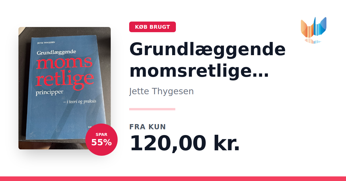 Lige nu kan du købe "Grundlæggende momsretlige principper" af Jette Thygesen til kun 120,00 kr. Du sparer hele 55% af nyprisen! Bogen du ser her er brugt, og i perfekt stand. Vi har i øjeblikket 4 eksemplarer til salg af "Grundlæggende momsretlige principper", så husk at se de forskellige udgaver.