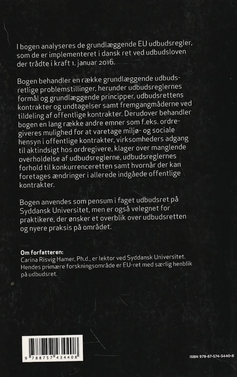 "Grundlæggende udbudsret" giver en indføring i de centrale EU-udbudsregler, som er implementeret i dansk ret med udbudsloven, der trådte i kraft 1. januar 2016. Bogen præsenterer en struktureret gennemgang af emnet og fokuserer på den juridiske tilgang til udbudsret. Bogen henvender sig primært til studerende på cand.merc.jur. og cand.jur.-uddannelserne og fungerer som et værdifuldt læremiddel. Carina Risvig Hamer inddrager også relevante eksempler og praksis fra både domstolene og Klagenævnet for Udbud, hvilket gør bogen anvendelig for dem, der beskæftiger sig med udbudsretlige spørgsmål i det daglige. Med et omfang på 897 sider tilbyder "Grundlæggende udbudsret" en grundig behandling af faget og er en vigtig ressource for både studerende og praktikere inden for området.
